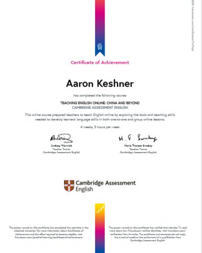 獲得劍橋大學(xué)英語考評部頒發(fā)的Certificate of Achievement結(jié)課認證證書。