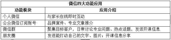 第2步,梳理微信功能。微信雖然講究小而美,可其功能列表越來越長,現(xiàn)在微信有20多個功能,再加上開發(fā)接口,使其功能更多。為了減少微信營銷的技術(shù)、培訓(xùn)成本,我們只要將其官方功能綜合利用,也能實現(xiàn)預(yù)期的營銷效果。根據(jù)嘗試,微信的“個人微信號”、“公眾微信訂閱號”、“微信群”、“朋友圈”四大功能,既簡單易上手,也是家長關(guān)注度較高的模塊。將功能進行梳理后,我們對其進行如下簡單分工,讓營銷變得簡單。
