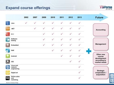 屬于產(chǎn)品擴(kuò)張,2002年創(chuàng)建時(shí)只開設(shè)了Java培訓(xùn)這一個(gè)課程,2007年才開始增加了.net,2009年由增加了C++、軟件測(cè)試、嵌入式三個(gè)課程,2010年到2012年每年新增一個(gè)培訓(xùn)課程,2013年新增三個(gè)培訓(xùn)課程,未來有可能會(huì)擴(kuò)展到會(huì)計(jì)、管理以及其他有市場(chǎng)需求的培訓(xùn),另外有可能進(jìn)行戰(zhàn)略收購(gòu)來增加培訓(xùn)課程