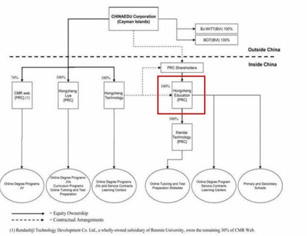 北京弘成教育科技有限公司是在美上市弘成教育集團的可變利益實體(VIE,variable interest entity),這次調(diào)查主要依據(jù)北京市第一中級人民法院的"協(xié)助執(zhí)行通知書",執(zhí)法機關(guān)凍結(jié)楊學(xué)山(音譯)所持有的該VIE公司28%股權(quán)份額,楊學(xué)山是公司股份的名義持有人。