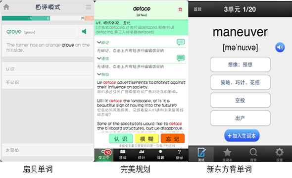 說(shuō)明:為控制變量,本次測(cè)評(píng)均采用4.13安卓系統(tǒng)測(cè)試比較(新東方學(xué)詞測(cè)試環(huán)境為iOS6,無(wú)安卓版本),對(duì)托福詞匯進(jìn)行記憶。