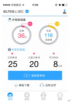 如圖,整體學習過程上,樂詞相比市場其它產品并無太大差異,涵蓋最基本的學、練、復習三步。每天的學習量按照學習計劃分配,開始學習時首先進入分組單詞學習,每組10個左右單詞,學習完成后進入測試練習階段,出錯后再次學習,直至復習完成。支持離線學習在線同步數(shù)據,不過目前語音包只能下載單詞詳解頁面,無法觀看視頻。