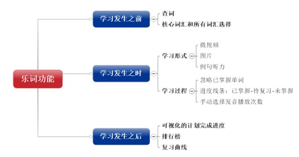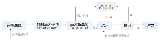 如上圖,用戶學習發(fā)生之前,可以按照個人需求程度,選擇核心詞匯和所有詞匯內容,此外也提供查詞功能便于學習者日常使用,直接反饋該詞在詞庫中的內容,包括意、音、例、圖、視頻等;學習過程中,從學習到練習,涵蓋了進度、忽略已掌握單詞、視頻、邊走邊聽等功能;學習完成后,還以可視化的形式顯示每個用戶的學習情況,并利用記憶曲線及時復習。