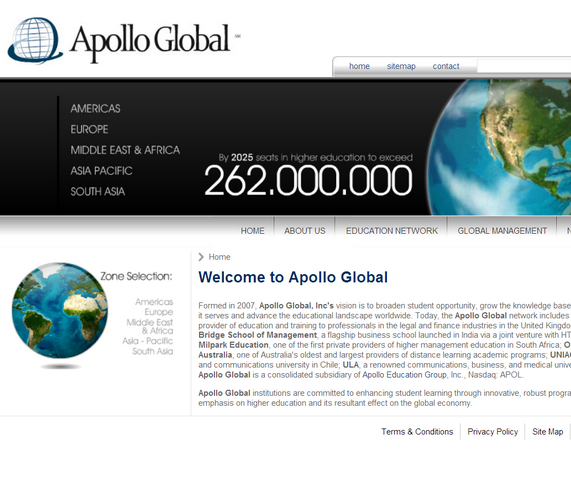 阿波羅教育集團(tuán)是一家美國(guó)的營(yíng)利性高等教育機(jī)構(gòu),也是全球最大的教育上市公司,有鳳凰城大學(xué)、亞維雅學(xué)院、西方國(guó)際大學(xué)等若干牟利教育機(jī)構(gòu)。
