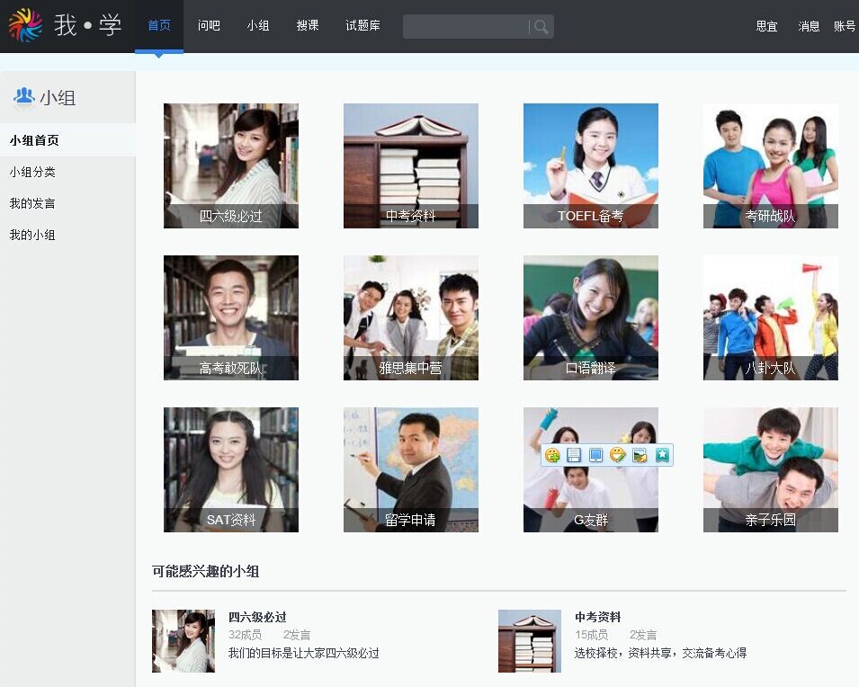 互動(dòng)性是“我·學(xué)”最大的一個(gè)特點(diǎn)。延續(xù)了上次新東方和網(wǎng)易聯(lián)合做的小項(xiàng)目—四六級(jí)模擬測試的風(fēng)格,用戶做題時(shí)可以選擇是否參與PK。用戶可以選擇好友,參與自己的PK項(xiàng)目,一起學(xué)習(xí)。在功能設(shè)置上,還有一項(xiàng)“小組”分類,用戶可以參加自己感興趣的小組。目前有“四六級(jí)必過”“高考敢死隊(duì)”“留學(xué)申請(qǐng)”“口語翻譯”等12個(gè)小組。