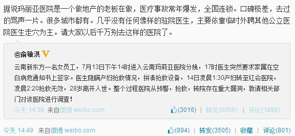 俞敏洪在微博上說明了事件始末:“云南新東方一名女員工,7月13日下午14時(shí)進(jìn)入云南瑪莉亞醫(yī)院分娩,17時(shí)醫(yī)生突然要求家屬在空白病危通知書上簽字。醫(yī)生隱瞞產(chǎn)婦搶救情況,拼湊搶救設(shè)備,14日凌晨1:30產(chǎn)婦轉(zhuǎn)至紅會(huì)醫(yī)院,凌晨2:20搶救無效,28歲離開人世。整個(gè)過程醫(yī)院從預(yù)警,搶救,轉(zhuǎn)院存在重大漏洞,敦請(qǐng)相關(guān)部門對(duì)該醫(yī)院進(jìn)行調(diào)查!”