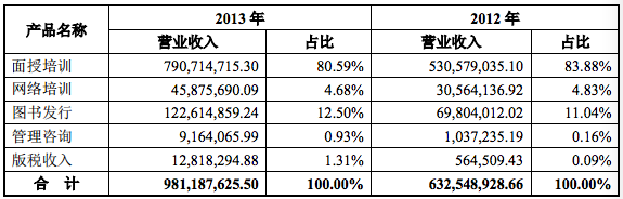 公告披露,華圖宏陽主營產(chǎn)品和服務(wù)主要包括面授培訓(xùn)、網(wǎng)絡(luò)培訓(xùn)、圖書發(fā)行和管理咨詢等。2013 年,華圖宏陽營業(yè)收入9.8億元,其中面授培訓(xùn)營收7.9億,占比80.58%;網(wǎng)絡(luò)培訓(xùn)營收4587萬,占比4.68%;圖書發(fā)行營收1.22億元,占比12.5%;管理咨詢營收916萬,占比0.93%;版稅收入1281.8萬,占比1.31%。2013年歸屬公司股東的凈利潤1.2億元,綜合毛利率62.4%。