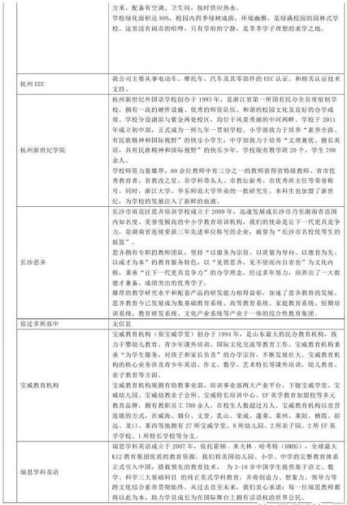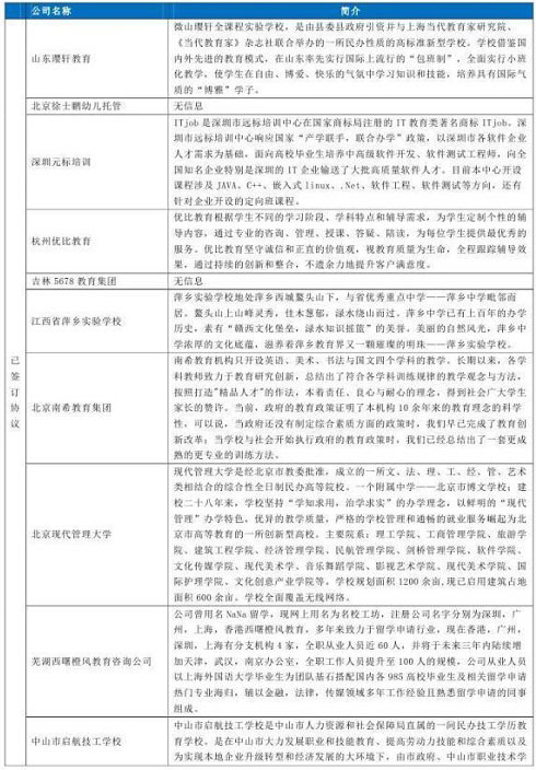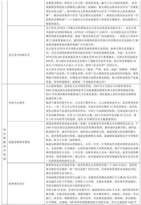 北京時(shí)間8月12日,大連控股發(fā)布補(bǔ)充公告稱景良教育自八月份起,開始與眾多教育機(jī)構(gòu)談判,目前已與十一家教育機(jī)構(gòu)(見文末圖表)完成了利潤(rùn)承諾協(xié)議的簽署,預(yù)計(jì)九月份完成第一階段整合九月至十二月會(huì)發(fā)起第二次整合,預(yù)計(jì)整合完成后2014年底利潤(rùn)不低于5億元,因目前處于預(yù)估階段,具體數(shù)據(jù)以景良教育財(cái)報(bào)為準(zhǔn)。