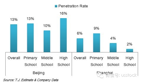雖然初中高中的入學(xué)人數(shù)較少,但我們從滲透率的角度觀察發(fā)現(xiàn),在市場已經(jīng)成熟的北京,好未來各階段滲透率最高的是高中。上海由于進入時間還不夠長,滲透率遠遠低于北京。