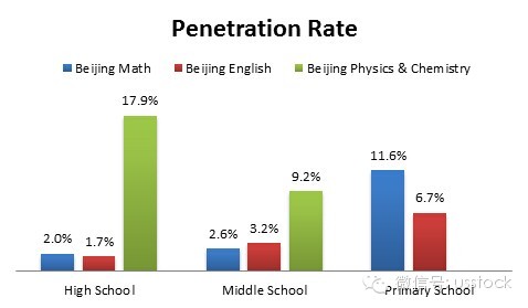 如果我們把各學(xué)科拆開來看會發(fā)現(xiàn),其原因在于好未來數(shù)學(xué)物理化學(xué)的占有率非常高,在高中階段,幾乎每5個人就有1個在好未來學(xué)習(xí)物理化學(xué),而在小學(xué),學(xué)而思的數(shù)學(xué)占有率也不低。