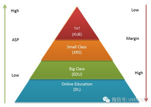 目前國內(nèi)上市的其他幾家教育公司里面,學(xué)大(XUE)是專注1對1教育的,新東方(EDU)和正保遠程教育(DL)則分別是大班模式和在線教育的典范。注意下圖。金字塔越頂端的客單價越高,決定了市場規(guī)模越小,且利潤率越低。