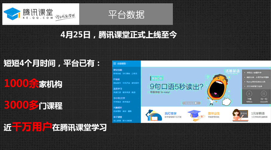 2. 產(chǎn)品發(fā)展非常迅速,上線4個月以來,已有1000余家機構(gòu)入駐,上線3000多門課程,近千萬用戶在騰訊課堂學(xué)習(xí),在線教育服務(wù)已初具雛形。