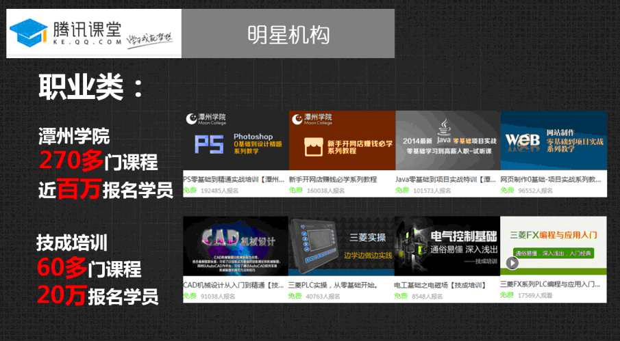 我們這里的明星機構(gòu)更多是技能類,比如像潭州學(xué)院開了200多門課,有學(xué)PS、學(xué)外部開發(fā)等等。可能他面對的對象是現(xiàn)在希望換工作,希望自己有一些技能,希望學(xué)一些能夠?qū)ぷ饔袔椭恼n程。所以這類課程在騰訊課程體系里面目前還是比較受歡迎。
