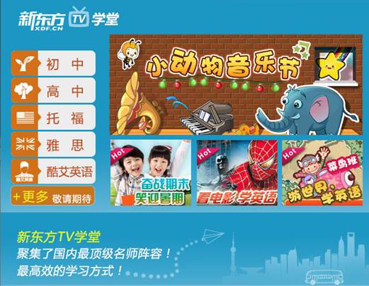 在今年5月22日,百視通與新東在線聯(lián)合宣布,雙方將在都看好的電視數(shù)字教育市場(chǎng)展開戰(zhàn)略合作。雙方將基于百視通IPTV業(yè)務(wù)推出“新東方TV學(xué)堂”,由新東方老師主講的中學(xué)全科教學(xué)內(nèi)容將可以直接點(diǎn)播,之后也會(huì)推出托福、雅思、日常英語(yǔ)等內(nèi)容。