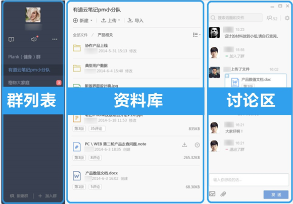 目前有道云筆記用戶可以直接通過有道云筆記進(jìn)入有道云協(xié)作,目前其界面被分為三個部分,中間是文件資料,左邊是群列表,右邊是討論區(qū)。