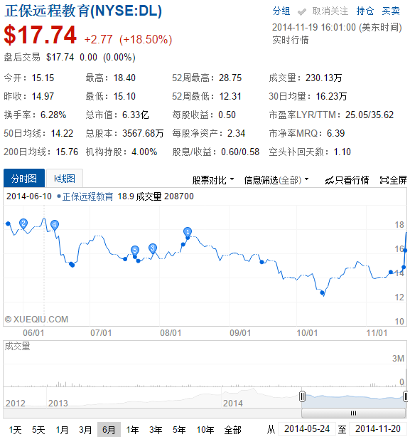 昨日,正保遠程教育發(fā)布截至9月30日的2014財年第四季度及全年未經(jīng)審計財報。財報發(fā)布后的首個交易日,收盤價報17.74美元,較上一個交易日收盤價大漲18.5%。