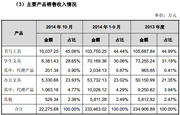 招股書披露,晨光文具在2011 年度至 2013 年度的營(yíng)收分別為14.47億元、19.00億元及 23.59億元,2014年1-9 月營(yíng)收為23.45億元。其中,2012年度及 2013 年度分別較上年度增長(zhǎng) 31.28%及 24.23%。