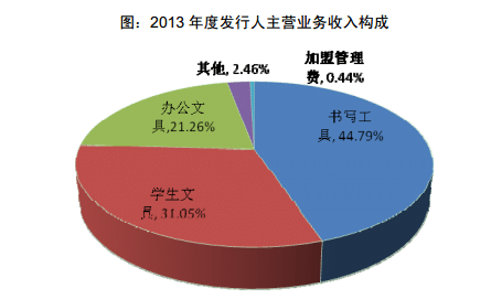 2013 年度公司主營(yíng)業(yè)務(wù)收入23.59億元, 其構(gòu)成比例分別為:書寫工具44.79%、學(xué)生文具31.05%、辦公文具21.26%、其他2.46%及加盟管理費(fèi)0.44%。2014年1-9 月公司主營(yíng)業(yè)務(wù)收入23.43億元, 其構(gòu)成比例分別為:書寫工44.27%%、學(xué)生文具 29.67%、辦公文具22.93%、其他2.75%及加盟管理費(fèi)0.38%。在主營(yíng)業(yè)務(wù)構(gòu)成中,其他主要包括計(jì)算器、耳機(jī)等學(xué)生電子產(chǎn)品,加盟管理費(fèi)為公司向晨光文具加盟店的被特許方收取的管理費(fèi)。