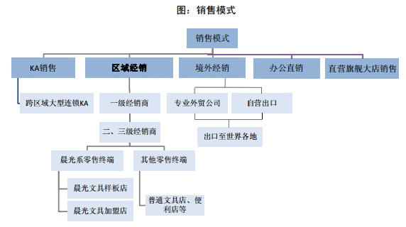 晨光文具的銷售模式以區(qū)域經(jīng)銷為主,結(jié)合KA銷售、境外經(jīng)銷、辦公直銷和直營(yíng)旗艦大店銷售。