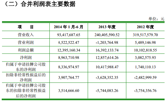 在2012年、2013年、2014年1月-6月,公司的營業(yè)收入分別為3.19億元、2.4億元、9341萬元。利潤總額分別為1010萬元、1639萬元、1239萬元;其中凈利潤分別為308萬元、1285萬元、896萬元。