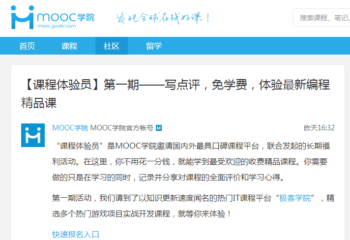 MOOC學(xué)院將通過(guò)“課程體驗(yàn)員”的選拔活動(dòng),邀請(qǐng)MOOC學(xué)院社區(qū)內(nèi)的活躍用戶(hù)免費(fèi)體驗(yàn)極客學(xué)院平臺(tái)上的熱門(mén)收費(fèi)課程,并撰寫(xiě)學(xué)習(xí)點(diǎn)評(píng),為更多學(xué)習(xí)者提供參考信息。