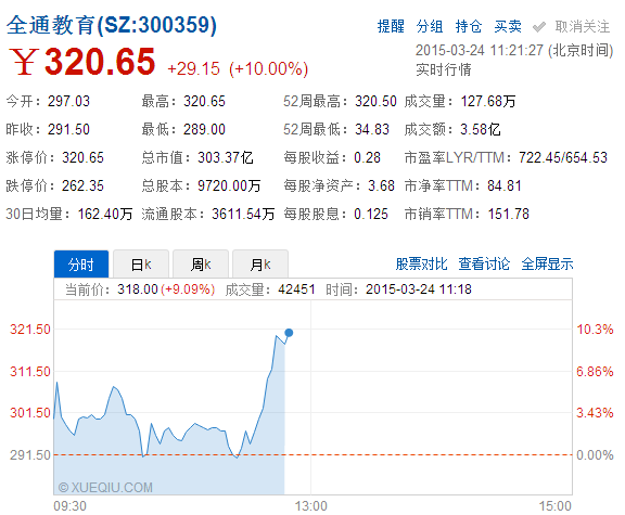 多知網(wǎng)3月24日消息,今日,全通教育早盤開盤后股價拉升,沖破300元,最高時達(dá)到320元,創(chuàng)下了A股最高紀(jì)錄。這距市場的上一只300元股已隔八年。