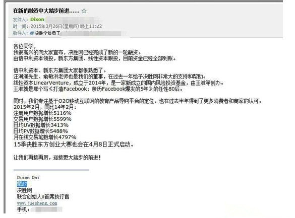 決勝網(wǎng)CEO發(fā)全員內(nèi)部郵件,正式宣布決勝網(wǎng)B輪融資完成,本輪投資由信中利資本領(lǐng)投,新東方集團、線性資本跟投,目前資金已經(jīng)全部到賬。