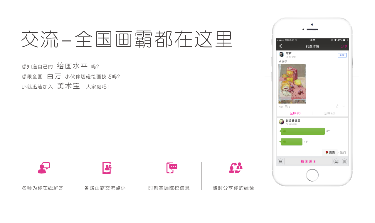美術(shù)寶APP 于2014年11月上線。APP上提供學(xué)生在線咨詢、指導(dǎo)、大量圖像素材、美術(shù)院校信息、美術(shù)系統(tǒng)課程等功能。