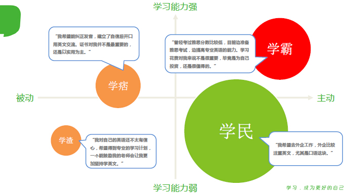 從上圖可以看到,縱軸是用戶學(xué)習(xí)能力的弱與強(qiáng),橫軸表現(xiàn)的是用戶學(xué)習(xí)的主動(dòng)性、被動(dòng)性。根據(jù)用戶配比,我們用戶分成四類:第一類為“學(xué)霸”,學(xué)習(xí)能力很強(qiáng),學(xué)習(xí)的意愿很強(qiáng);第二類是滬江的主要用戶,稱為“學(xué)民”,學(xué)習(xí)主動(dòng)性很強(qiáng),但學(xué)習(xí)能力相對(duì)偏弱,需要指導(dǎo);還有兩類占比較小的用戶群,分別為“學(xué)痞”和“學(xué)渣”。如果一個(gè)學(xué)生/用戶很容易被一款在線游戲或其他產(chǎn)品所吸引,很難成為一個(gè)在線學(xué)習(xí)的定性用戶。在線學(xué)習(xí)對(duì)于用戶主觀能動(dòng)性要求非常高。