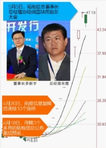 5月5日,受董事長(zhǎng)、總經(jīng)理被查影響,拓維信息打開(kāi)漲停板,下跌5.49%,報(bào)收44.6元。