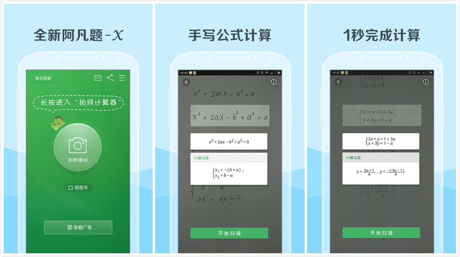 阿凡題是專注K12領(lǐng)域的拍照答題類App,用戶拍下題目并上傳,幾秒鐘之內(nèi)服務器就能從題庫中搜到解題步驟和答案,國內(nèi)同類產(chǎn)品還有學霸君、學習寶、小猿搜題等。新發(fā)布的阿凡題-X則將自己定義為一款“拍照計算器App”(國外同類產(chǎn)品還有Myscript和Photomath),支持手寫公式識別,可以完成加減乘除的基本運算、解一元一次方程、一元二次方程和二元一次方程組。這意味著,用戶可以用阿凡題-X拍攝以上方程的任何變形,無論手寫體還是印刷體,應用都可以在1秒鐘左右給出解題步驟和答案。“阿凡題-X”今天作為一款獨立App在應用商店上線,但其功能也會被嵌入原搜題App“阿凡題學習神器“中。