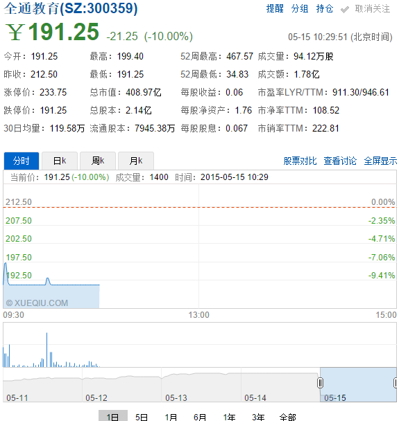 昨日,全通教育因公共傳媒出現(xiàn)公司的信息而申請(qǐng)停牌,今日發(fā)布澄清公告后復(fù)牌,開盤后即跌停,報(bào)191.25元,(多知網(wǎng) Karyn)