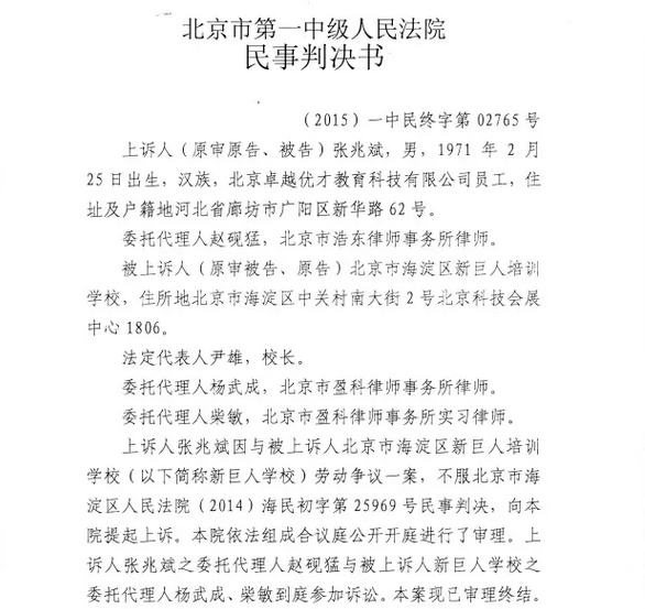 2015年3月19日,法院公布了巨人集體出走案終審民事判決書。張兆斌、趙昱、劉劍、宋涵希、丁凱、李萌、李泉、趙國(guó)智、饒海波、侯瑩違反《知識(shí)產(chǎn)權(quán)保護(hù)和競(jìng)業(yè)禁止協(xié)議》,他們須繼續(xù)履行合同規(guī)定的競(jìng)業(yè)限制,直到期滿,累計(jì)向巨人學(xué)校賠付金額不低于100萬(wàn)元人民幣的賠償款。