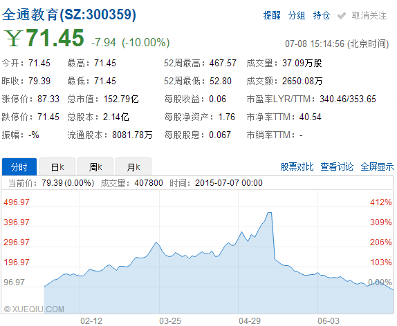 全通教育5月13日達(dá)到52周最高點(diǎn)467.57元,7月7日收盤(pán)價(jià)79.39元,今日開(kāi)盤(pán)價(jià)71.45元跌停。(多知網(wǎng) Karyn)