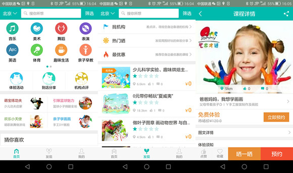 "熊孩子 "主打3到12歲兒童的素質(zhì)教育體驗課程、親子活動等,為家長基于地理位置推送體驗課優(yōu)惠信息以及周末親子活動等。