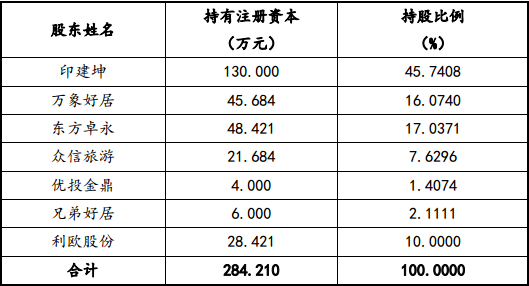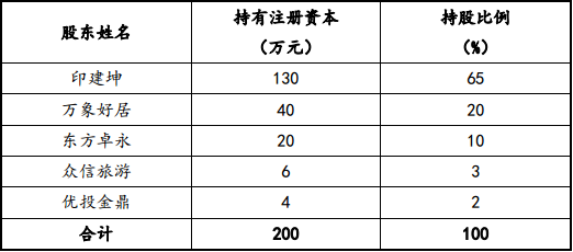 同時,東方卓永出資1500萬元,認(rèn)購28.421萬元注冊資本;眾信旅游出資?300萬元,認(rèn)購5684萬元注冊資本;萬象好居出資300萬元,認(rèn)購 5684 萬元注冊資本。增資完成后,各方所占股份情況如下圖: