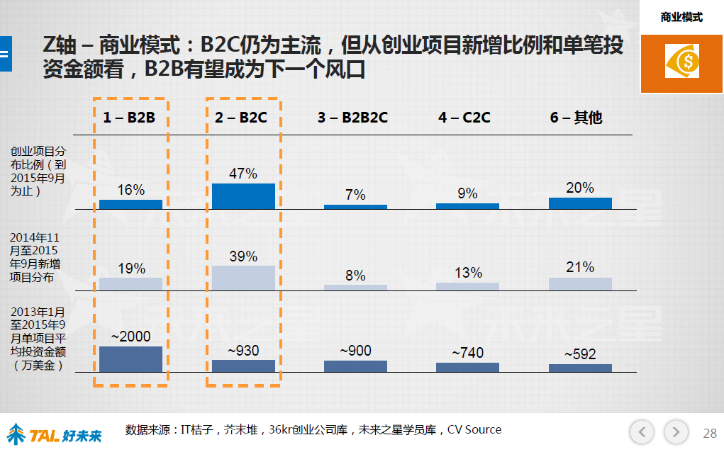 相關(guān)數(shù)據(jù)也顯示,雖然B2C 現(xiàn)在仍是主流(截止至2015年9月,B2C項目占所有項目的47%),但從單筆投入和近一年來的新增項目比例來說, B2B開始發(fā)力。從2014年底以來的B2C類新增項目占所有新增項目的39%,單筆投資金額在930萬美金;而對于B2B來說,從2014年底以來的新增項目占所有新增項目的19%,單筆金額在2000萬美金,單項目投資金額遠超B2C。