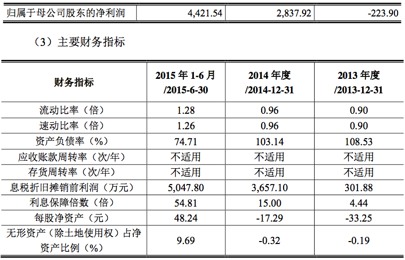 可以看出,若之前60家子公司自初期就不屬于京翰,則京翰近兩年及一期的流動比率分別為 0.90、0.96 和1.28, 速動比率分別為 0.90、0.96 和 1.26,公司資產(chǎn)流動性不斷提高。2013 年末、2014年末及2015年6月末,資產(chǎn)負債率分別為108.53%、103.14%和74.71%,利息保障倍數(shù)分別為4.44、15.00 和 54.81,公司的償債風險不斷降低。2013年和 2014年公司息稅折舊攤銷前利潤分別為301.88 萬元、3657.10萬元和5047.80 萬元,報告期內(nèi)公司凈利潤不斷提升,盈利能力不斷增強。