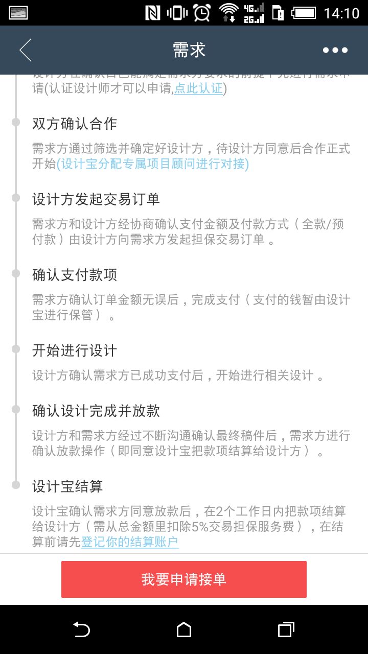 因為設(shè)計寶的一部分功能是設(shè)計師閑暇時間接活,所以在用戶注冊時,系統(tǒng)就會要求用戶標(biāo)明身份:設(shè)計師或商家。想要吸引更多的商家來設(shè)計寶發(fā)布需求,前提是現(xiàn)有設(shè)計師的產(chǎn)品品質(zhì)好,相應(yīng)的對設(shè)計師的水平要求也比較高。所以設(shè)計寶在審核設(shè)計師申請時,從作品、經(jīng)歷、畢業(yè)院校三個角度考核設(shè)計師。如果商家在設(shè)計寶發(fā)布需求,設(shè)計師接單,最終交單之前,商家支付的項目款項由設(shè)計寶監(jiān)管,雙方都確認(rèn)項目結(jié)束后,設(shè)計寶會將這筆交易金額返還給設(shè)計師,但是會抽取5%的交易擔(dān)保服務(wù)費。