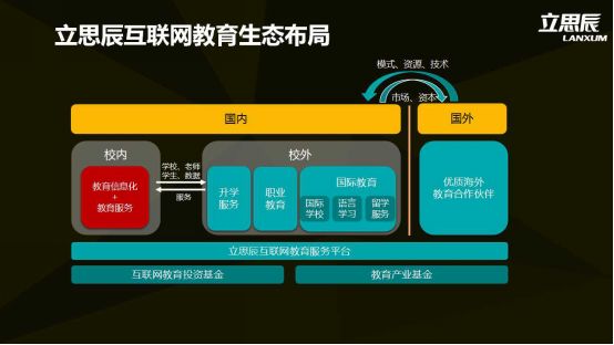 如上圖,圖中右側(cè)就是立思辰選擇的賽道,也是立思辰核心的戰(zhàn)略業(yè)務(wù)板塊,包括升學(xué)服務(wù)、職業(yè)教育、國際教育。在國際教育板塊中,立思辰會重點(diǎn)布局國際學(xué)校、語言學(xué)習(xí)、留學(xué)服務(wù)。黃威稱,上述的三大業(yè)務(wù)板塊之間是相互關(guān)聯(lián)的,這種關(guān)聯(lián)可以形成高效的業(yè)務(wù)協(xié)同。但是這些業(yè)務(wù)協(xié)同還不夠,最后要形成一個立思辰互聯(lián)網(wǎng)教育服務(wù)平臺,這一平臺將在明年實(shí)現(xiàn)。屆時(shí),平臺上用戶會獲取所有立思辰所提供的的教育服務(wù)。