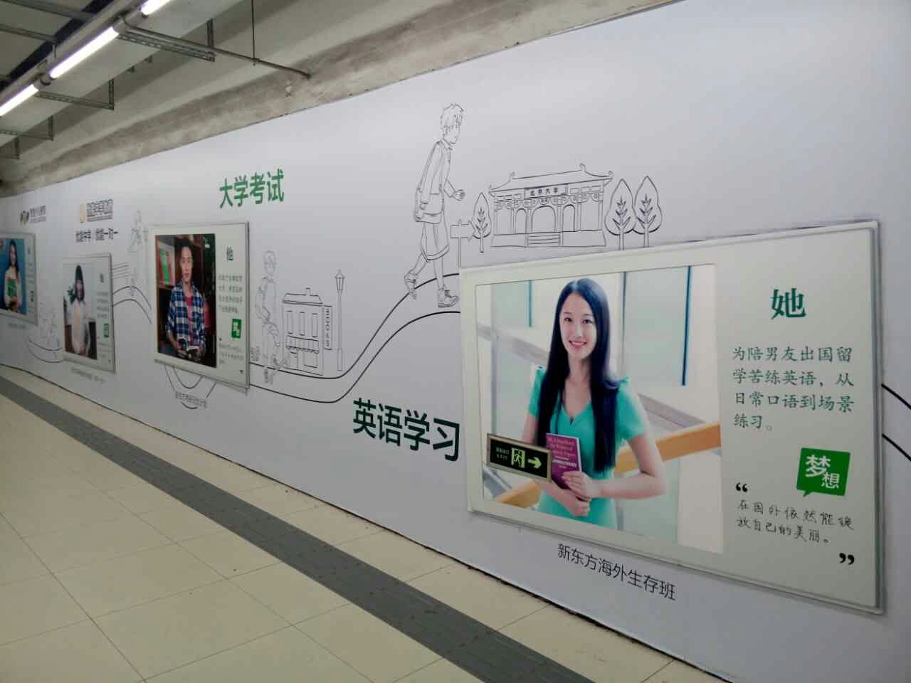 新東方打出了和以往不用的廣告,第一次在廣告墻上完整的描繪出了新東方的產(chǎn)業(yè)鏈,其中完整的包括泡泡少兒、優(yōu)能中學(xué)、大學(xué)考試、英語(yǔ)學(xué)習(xí)、留學(xué)考試(北美、英聯(lián)邦、小語(yǔ)種)、前途出國(guó)、游學(xué)等業(yè)務(wù)線。