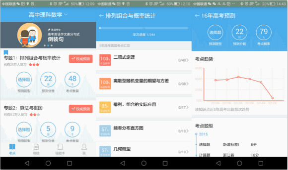 目前,百度高考APP以高考考點切入,分為英語、理科數(shù)學(xué)、文科數(shù)學(xué)、物理、化學(xué)、生物六門課程, 將每門課程按照專題劃分,并將每個專題都和考點預(yù)測連接起來,在每個專題下,為學(xué)生提供了幾十道練習題,學(xué)生可以作答和查看參考答案等。