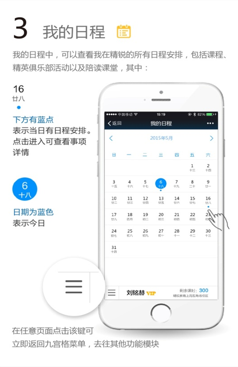 學(xué)生版的主要功能全程跟蹤學(xué)員的學(xué)習(xí)過程,提高家?;拥男省1热?,在學(xué)生版的“我的日程”中,學(xué)生可以查看學(xué)生所有的日程安排、課程講義,精英俱樂部活動以及陪讀課堂等。