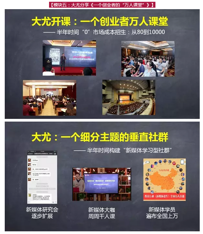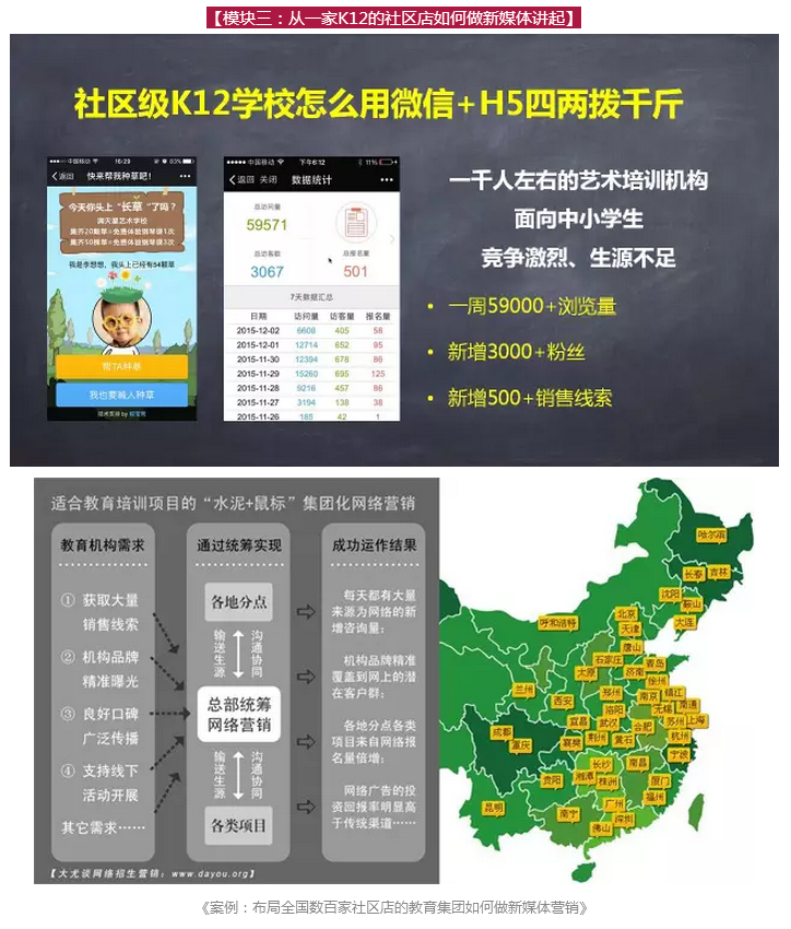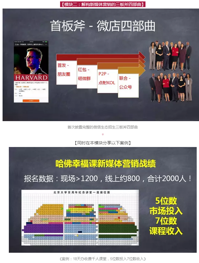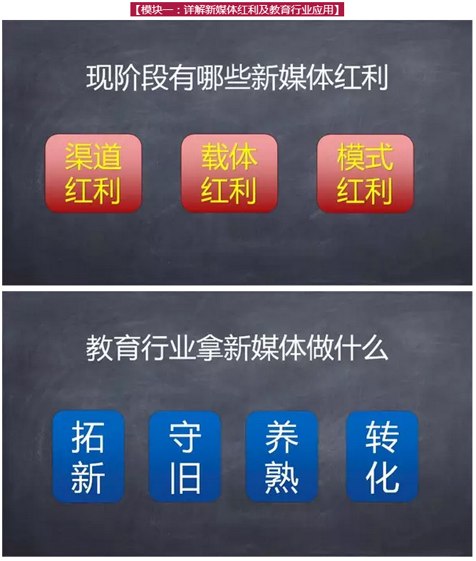 在這次“萬人課堂”上,全天課程內(nèi)容分六大模塊合計(jì)300頁P(yáng)PT,包括3個(gè)新媒體渠道詳解,3個(gè)最新的新媒體載體,6個(gè)教育行業(yè)最新新媒體營(yíng)銷案例,9個(gè)視頻。