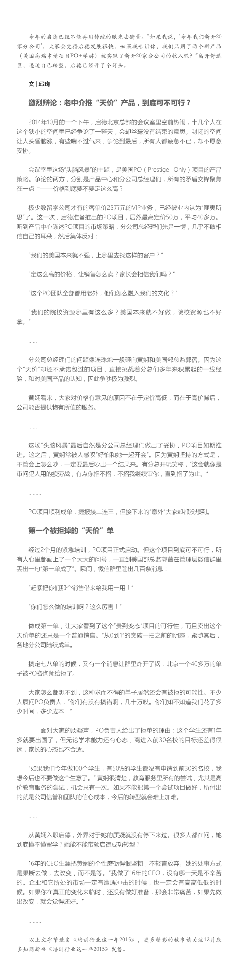 今年的啟德已經(jīng)不能再用傳統(tǒng)的眼光去衡量。“如果我說,‘今年我們新開20家分公司’,大家會(huì)覺得啟德發(fā)展很快。如果我告訴你,我們只用了兩個(gè)新產(chǎn)品(美國高端申請(qǐng)項(xiàng)目PO+學(xué)游)就實(shí)現(xiàn)了新開20家分公司的收入呢?”離開舒適區(qū),逼迫自己轉(zhuǎn)型,啟德已經(jīng)開了個(gè)好頭。