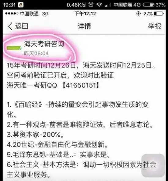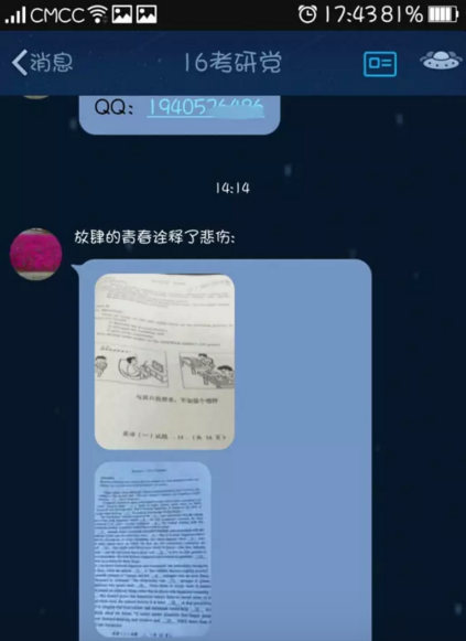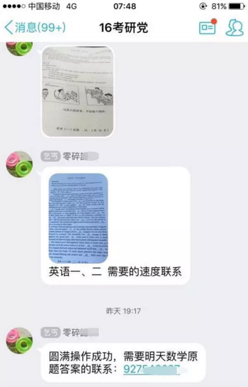 據(jù)其他受訪學(xué)生提供的聊天記錄截圖顯示,“2016華東師范”QQ群、海天考研咨詢(QQ空間)、“16考研黨”QQ群分別發(fā)送了考研政治部分材料題、政治選擇題近一半答案、以及兩科考研英語試卷最后一頁拍照圖,而發(fā)送時(shí)間顯示為12月25日上午,這些機(jī)構(gòu)同時(shí)提供了電話與QQ稱“需要下一科的聯(lián)系XX”。
