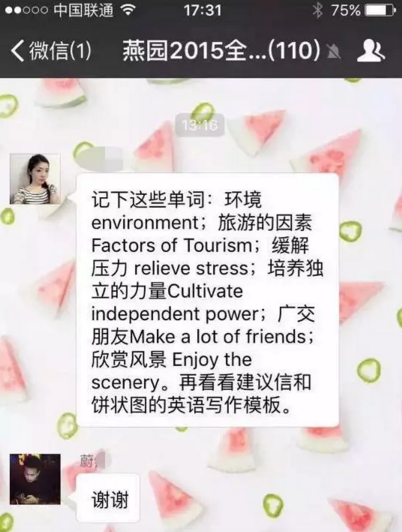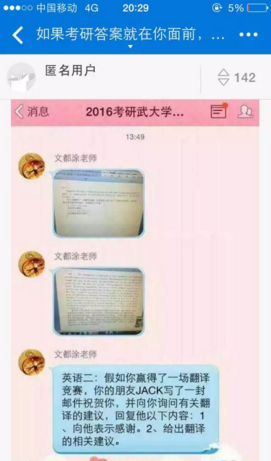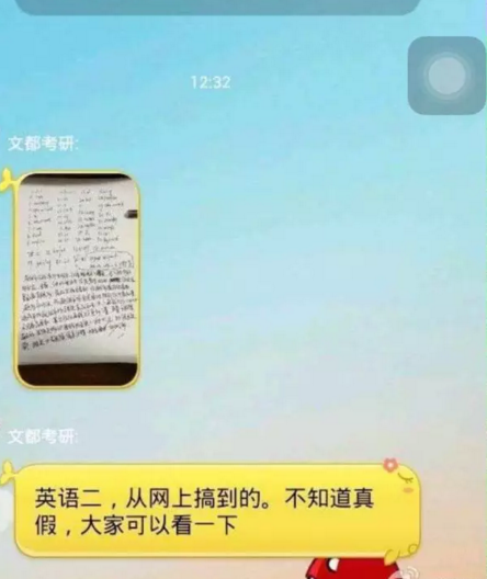 本次參加考研的一名同學(xué)向南都記者提供的消息截圖顯示,12月26日13點(diǎn)15分,距離14時(shí)英語考試開考前,“2016文都考研”QQ群、“燕園2015全xx”微信群、“2016考研武大”QQ群發(fā)布了考研英語(二)大作文、小作文以及作文模板。
