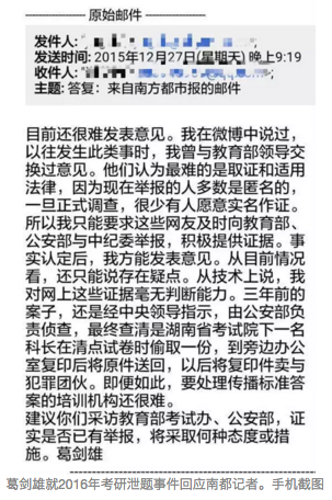 全國政協(xié)常委、復(fù)旦大學(xué)教授葛劍雄,曾在兩會(huì)公開質(zhì)疑研究生考試泄題事件。昨日,葛劍雄郵件回復(fù)南都記者稱,“以往發(fā)生此類事時(shí),我曾與教育部領(lǐng)導(dǎo)交換過意見。他們認(rèn)為最難的是取證和適用法律,因?yàn)楝F(xiàn)在舉報(bào)的人多數(shù)是匿名的,一旦正式調(diào)查,很少有人愿意實(shí)名作證?!?/p>
