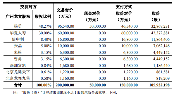勤上光電擬以發(fā)行股份及支付現(xiàn)金的方式購買楊勇、華夏人壽、信中利、張晶、朱松、曾勇、深圳富凱、北京龍嘯天下及北京龍舞九霄9名交易對(duì)方合計(jì)持有的廣州龍文100%股權(quán)。其中,向楊勇支付現(xiàn)金對(duì)價(jià)5億元,剩余差額15億元由勤上光電以發(fā)行股份的方式向9名交易對(duì)方支付對(duì)價(jià)。