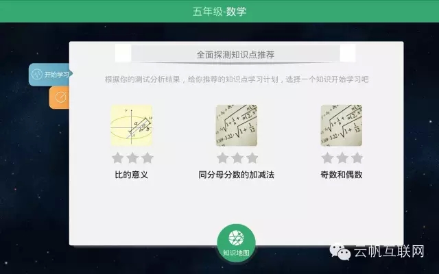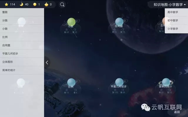 這是除了智慧課堂應(yīng)用以外最重要的應(yīng)用,主要目的是幫助同學(xué)們找出對知識(shí)點(diǎn)掌握的不足。自主學(xué)習(xí)系統(tǒng)將不同學(xué)科按照年級(jí)分成若干個(gè)單獨(dú)的知識(shí)點(diǎn),每個(gè)知識(shí)點(diǎn)配有獨(dú)立題庫和教學(xué)短視頻。系統(tǒng)還加入了游戲元素。下面以數(shù)學(xué)為例看一下整個(gè)系統(tǒng)的使用過程和亮點(diǎn)。